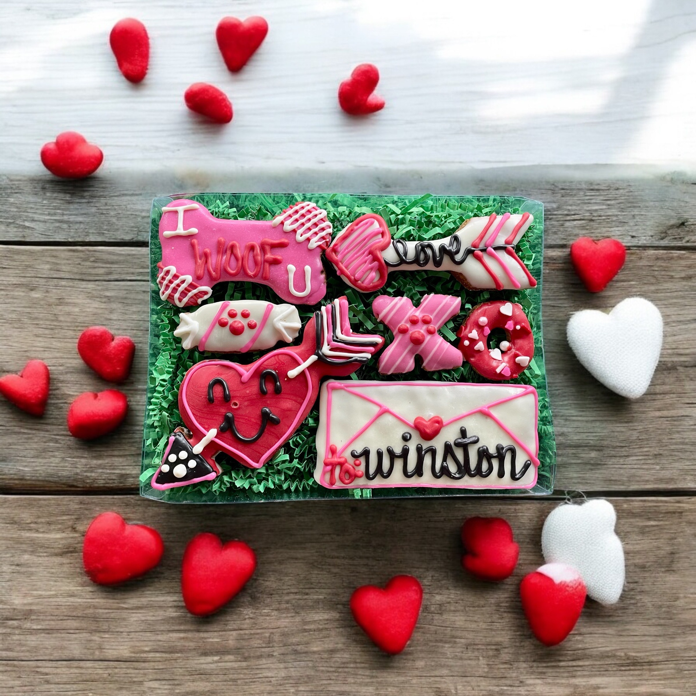 All these classics are hand dipped in yogurt icing with designs completely customized for your puppy love…. sure to make pooch give some SLOPPY KISSES this Valentines Day!