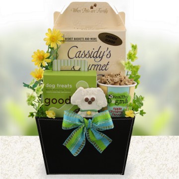 A beautiful black faux leather container holds this assortment of doggie treats that is certain to make your favorite dog’s tail wag. A collection of crunchy doggy biscuits and even our delicious bake at home biscuit mix complete with bone shaped biscuit cutter and easy directions. Our Doggy Wags dog gift is perfect for puppies a bit under the weather; puppy graduation, potty training and even I miss you or many thanks. See those tails wag with this dog gift filled with yummy treats.