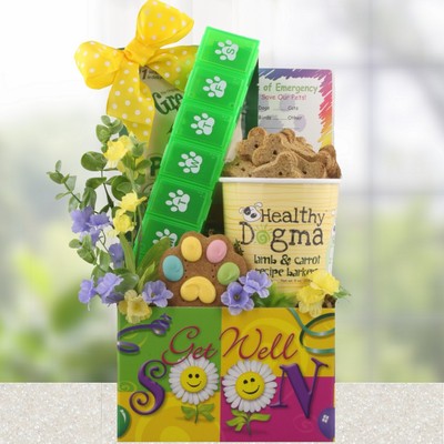 Send get well wishes to your favorite canine with this get well themed doggy gift basket. This gift includes the famous Pill Pockets® which are healthy treats with a patented pocket to safely conceal the medicine. An adorable pill minder is also included to help sort and maintain a whole week’s supply of medications. This gift makes an awesome dog get well gift!